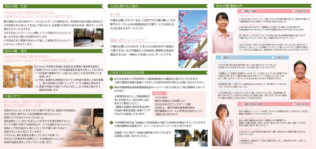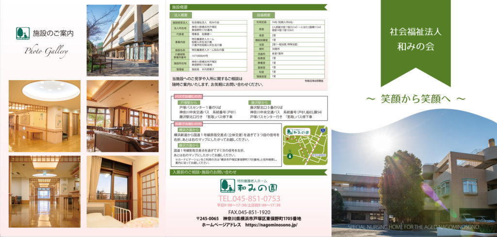 パンフレット 法人概要 施設経営法人社会福祉法人 和みの会法人所在地〒245-0065 神奈川県横浜市戸塚区東俣野町1705番地代表者理事長 佐藤健一事業内容特別養護老人ホーム 和みの園 運営短期入所生活介護 和みの園 運営介護予防短期入所生活介護 和みの園 運営施設名称特別養護老人ホーム 和みの園介護保険事業所番号1471000644号施設所在地〒245-0065 神奈川県横浜市戸塚区東俣野町1705番地